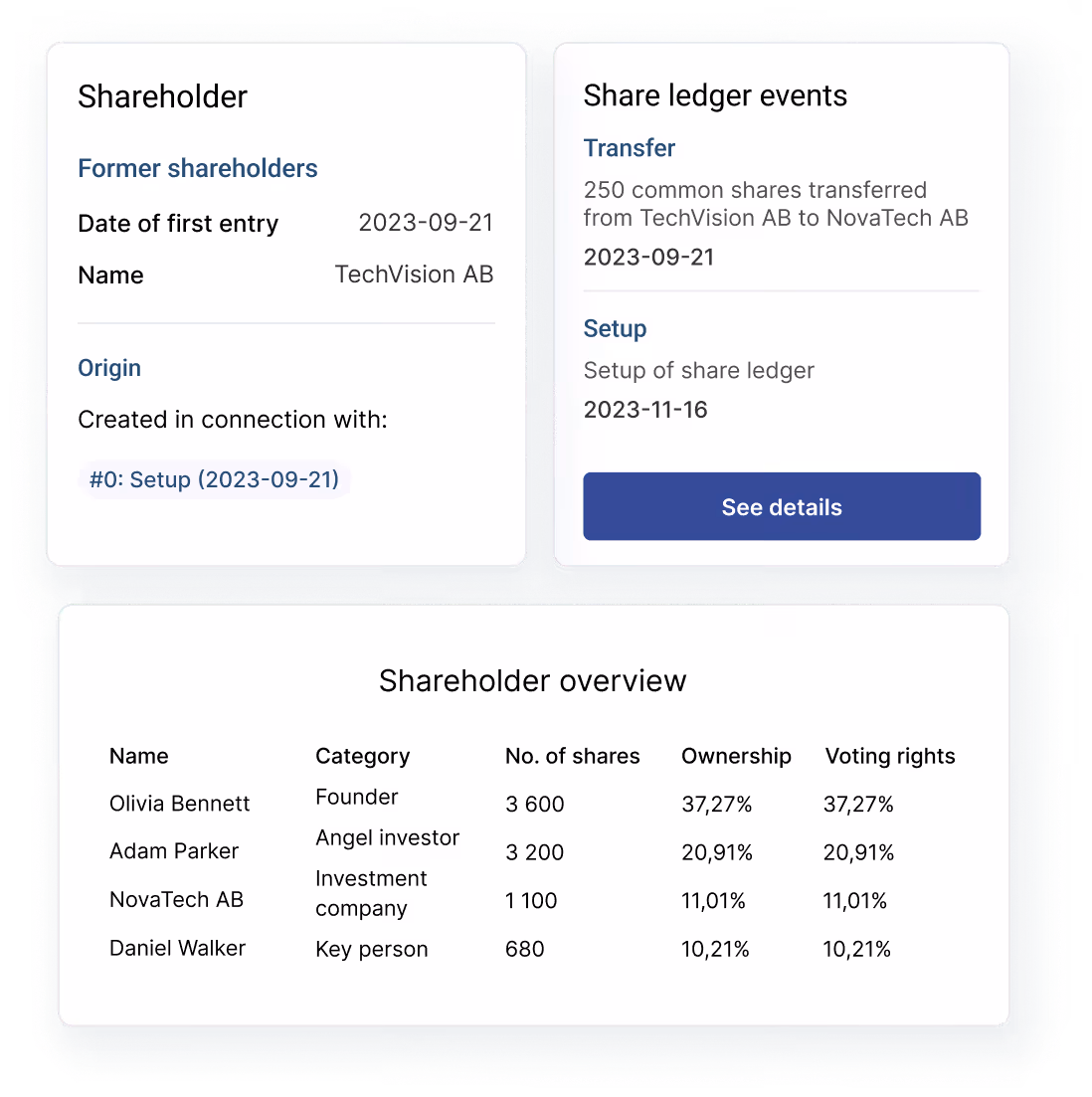 Finally, your shareholders get a clear overview of their unlisted shares and derivatives in their own digital equity account, with full event history, latest valuation, and much more.
